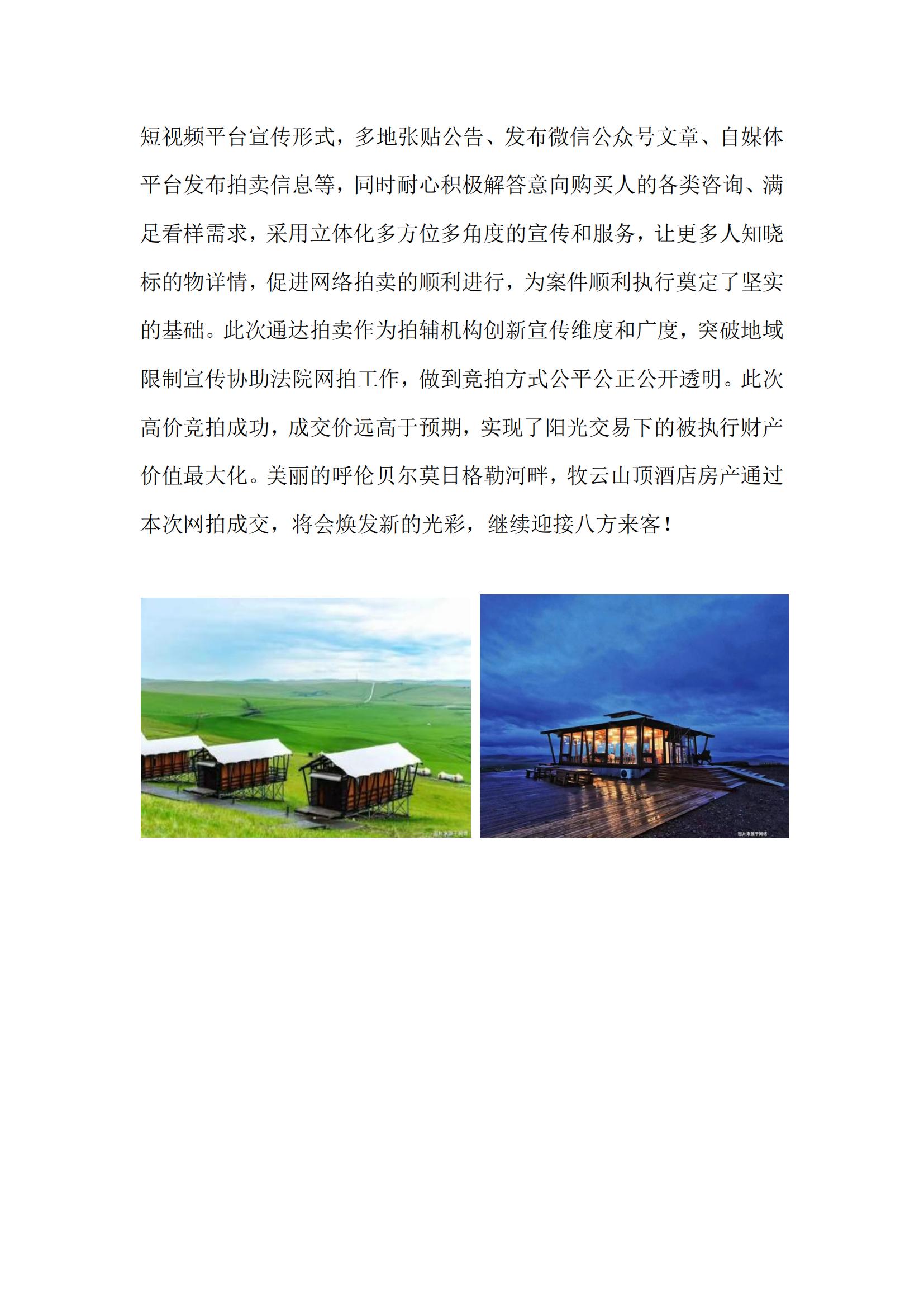 專業(yè)拍賣機構,助力司法拍賣 我區(qū)拍賣企業(yè)開始入圍法院司輔機構已經(jīng)兩年有余,在入圍的這兩年多時間里,拍賣企業(yè)作為專業(yè)的拍賣機構不斷的完善自身,利用我們的專業(yè)助力司法拍賣,提高司法拍賣的成交額。拍賣企業(yè)的專業(yè)就是拍賣,作為司法輔助機構,我們拍賣企業(yè)更能夠從委托方角度出發(fā),從標的角度出發(fā),從競買人的角度出發(fā),深刻的了解各方的切實需求。也更可以找到標的的亮點從而非常專業(yè)的對其進行宣傳,通過拍賣企業(yè)本身的客戶資源以及通過網(wǎng)站、公眾號、宣傳視頻等多種新的宣傳自媒體齊發(fā)力,已經(jīng)突破了地域限制,使得更多的潛在買家可以看到和了解標的。同時專業(yè)的拍賣公司有著強大的拍賣實力和風控能力,對于拍賣過程中出現(xiàn)的問題以及未出現(xiàn)的問題都會做到提前準備預案,這樣為標的的最后成交奠定了專業(yè)而扎實的基礎。因為術業(yè)有專攻,讓專業(yè)的人做專業(yè)的事更能讓他們發(fā)揮所長,讓價值得到最大化,也能盡快的找到解決辦法,從而節(jié)省成本。 昨天收到來自內(nèi)蒙古通達拍賣有限責任公司的好消息,位于呼倫貝爾草原“打卡”標志地的“牧云山頂酒店”房產(chǎn)網(wǎng)絡司法拍賣通過該企業(yè)的輔助宣傳,網(wǎng)絡拍賣產(chǎn)生了激烈的競價,經(jīng)過277 輪競價后,最終以 20,627,063 元成交,溢價率達到 499%。 這便是一個很好的例子,希望我們?nèi)珔^(qū)的拍賣企業(yè)都能充分發(fā)揮自身專業(yè)優(yōu)勢,助力司法拍賣,在這一領域開疆擴土,以此為契機,從點到線再到面的全面發(fā)展。